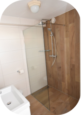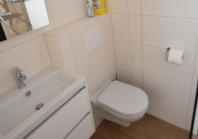 De badkamer is voorzien van een hangtoilet, badmeubel, ruime inloopdouche en haarföhn .