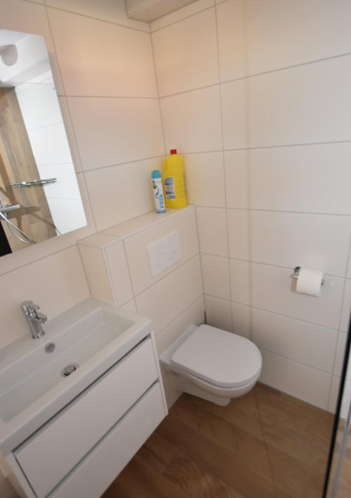 Das Badezimmer hat eine freihängende Toilette, Waschbecken, dusche und einen Föhn.